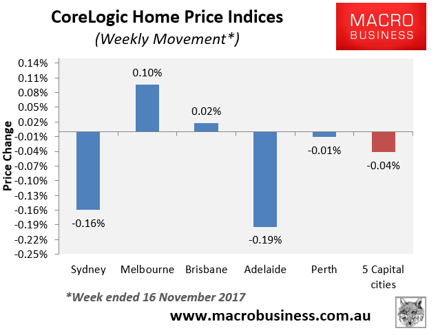 In the week ended 16 November 2017, the CoreLogic 5-city daily dwelling price index, which covers the five major capital city markets, fell another 0.04%: