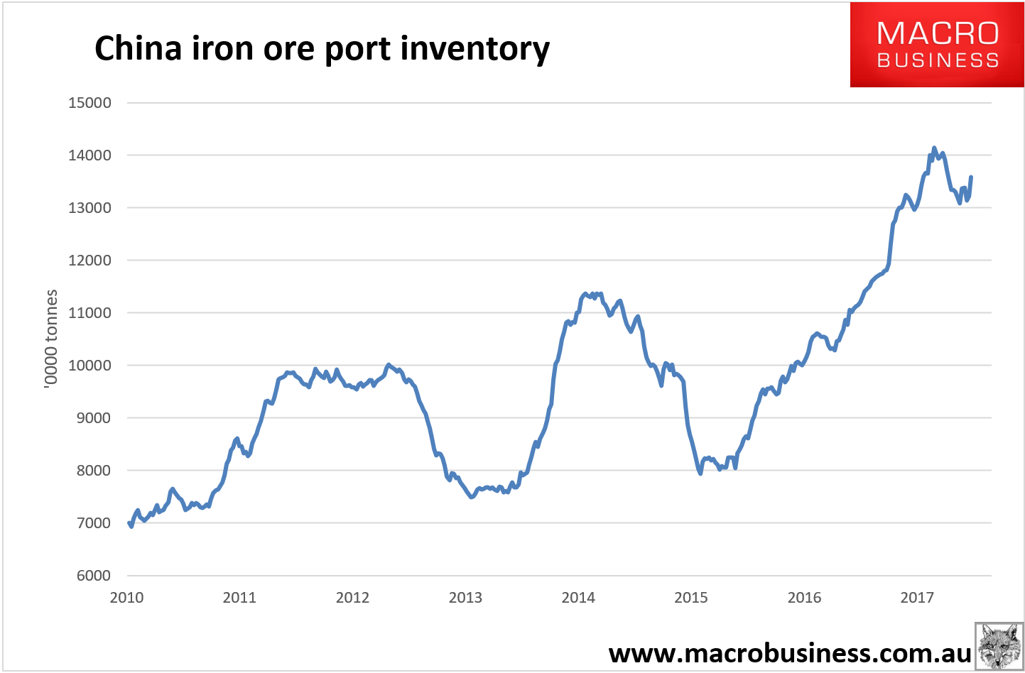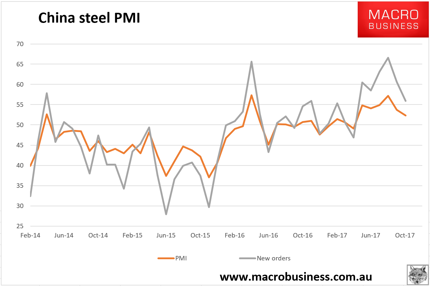 Markets took the data as glass half full. It is, to the extent the steel PMI indicates an orderly slowdown. But, it is still a slowdown and it runs until mid-March next year. It hasn’t even started in earnest. If steel output at these levels delivers that kind of port stocks jump then iron ore is going to keep falling.