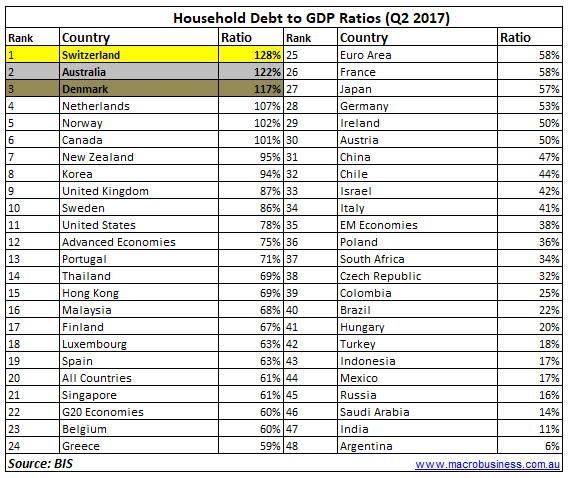 The next table shows the ratios of household debt to GDP as at the June quarter of 2017. As you can see, Switzerland (128%) has again taken gold with Australia (122%) taking silver and Denmark (117%) bronze. The Netherlands (107%) and Norway (102%) round out the top five: