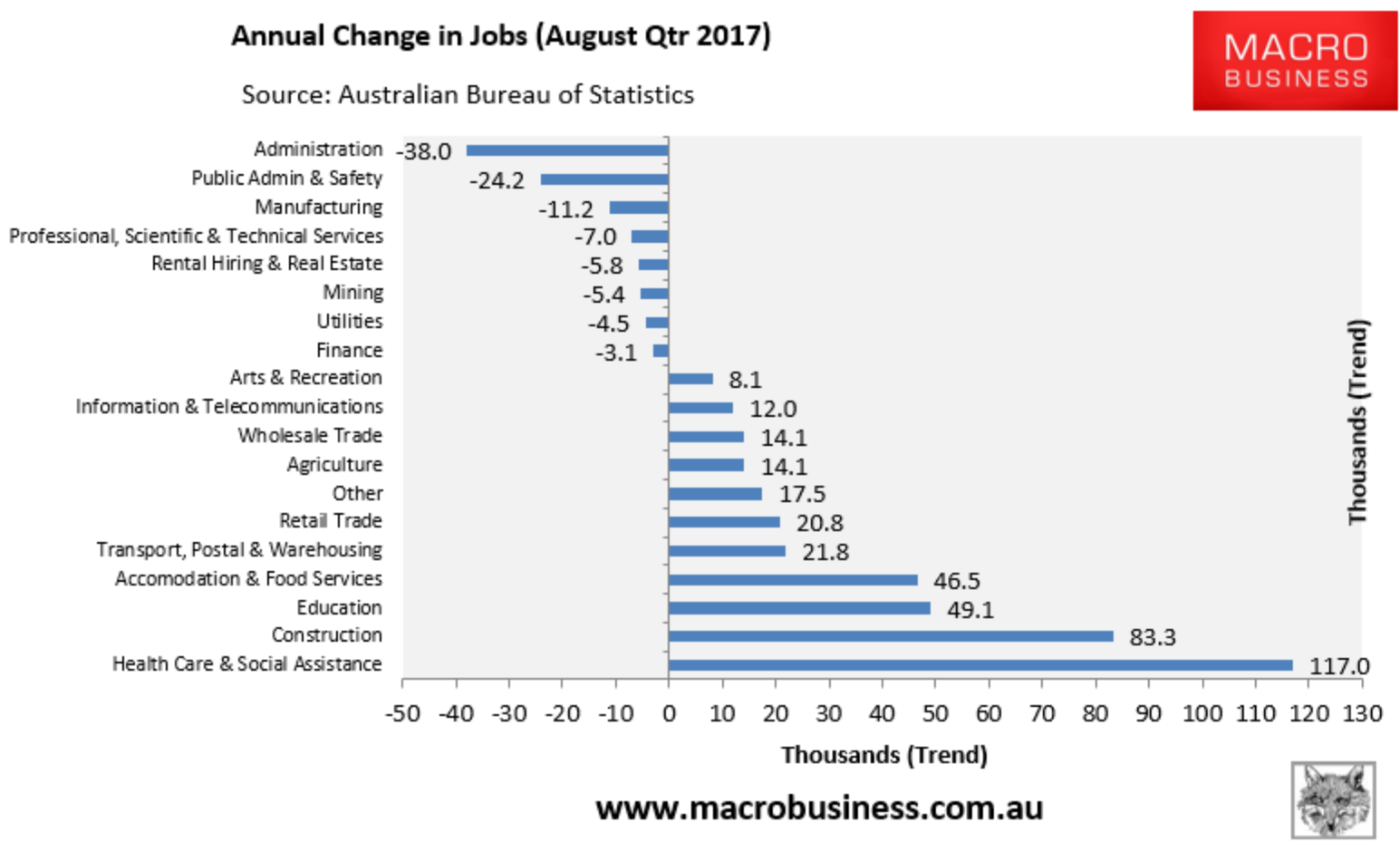 The Coalition can rightly claim credit for construction jobs via its asset recycling and mass immigration program. The health care boom is at least in part owing to Labor’s NDIS roll out. Tourism and education are largely exchange rate driven.