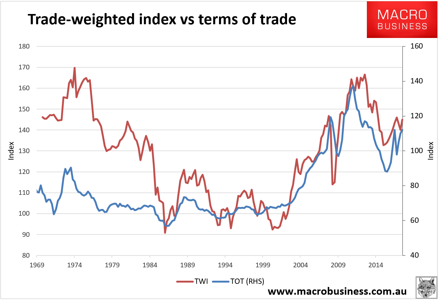 The gap between the 10 year spread and Aussie is now at its widest since the mid-1980s as well. That wedge is the result of the terms of trade: