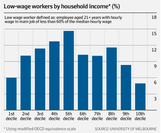 Analysis provided to The Australian Financial Review by the Melbourne Institute of Applied Economic and Social Research shows that 13 per cent of workers effectively on minimum wages live in households that enjoy the top 20 per cent of incomes in the nation.
