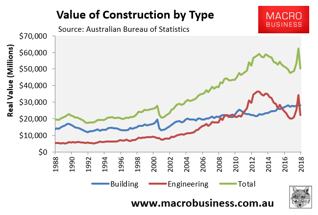 The 19.4% quarterly fall in construction activity was driven by engineering construction, which tanked by 35.4% in real terms. By contrast, building construction rose by 0.2% over the quarter: