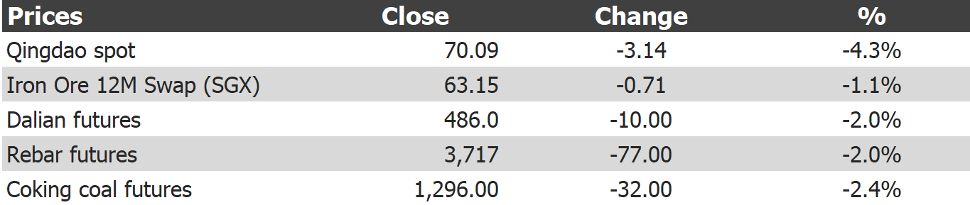Tianjin benchmark fell $1.75 to $70.25. Paper held on Friday night as risk took off. Steel is breaking. Coking coal tracking the lot. We’re been triggered a little earlier than usual by the Trump tariffs but this is typical price action moving into Q2. I expect we’ll not stop selling in trend terms now until the end of June so hang on. I’m aiming for 3000 for rebar, $50 for iron ore and 1000yn for coking coal.