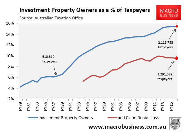 As you can see, 15.5% of taxpayers were a property investor in 2015-16, with 9.6% of taxpayers negatively geared.