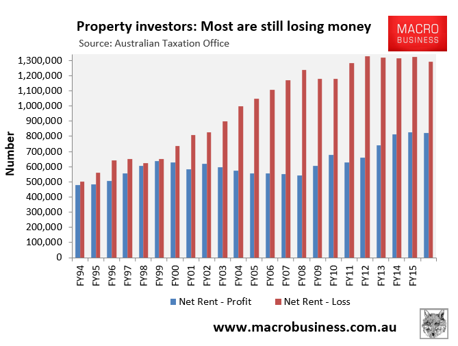 1,291,389 people claimed net rental losses (were negatively geared), representing 61% of total property investors, down slightly from the 1,323,277 negatively geared investors the year before: