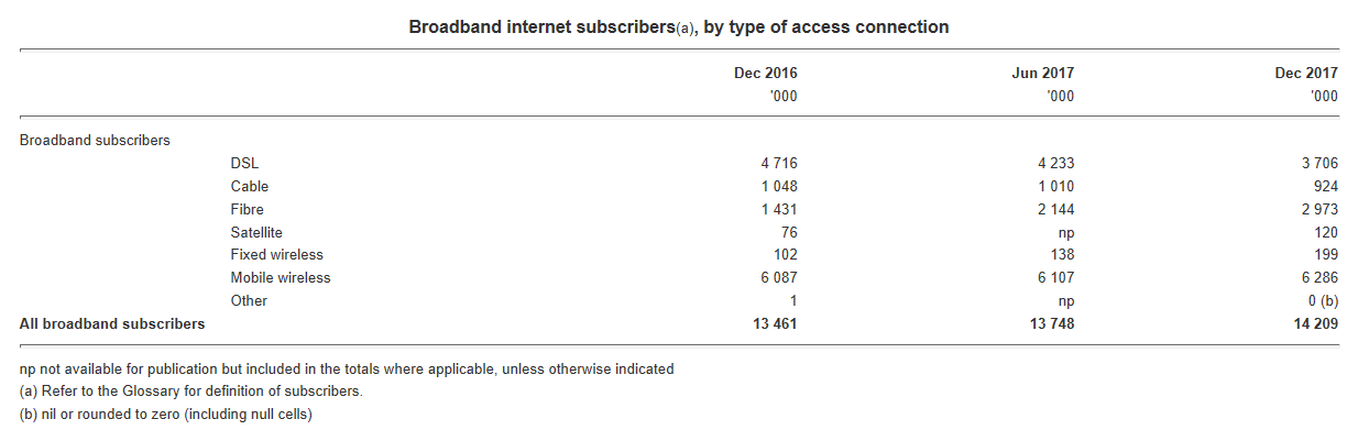As you can see, DSL remains the dominant form of fixed-line service, although Fibre is catching up fast – most likely due to the roll-out of the NBN.