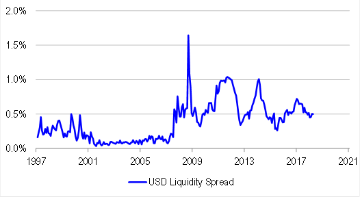 1. A GDP-weighted average USD liquidity spread based on US LIBOR-OIS and cross-currency basis swap spreads.