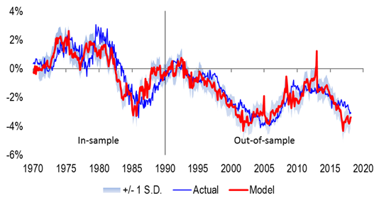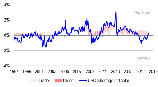 In other words, the future marginal supply of USDs via trade is likely to be smaller than it is today, contributing to tighter USD funding conditions. At the same time, spreads remain elevated. Therefore, our overall indicator has tightened further to its highest level since mid-2016.