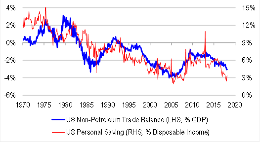 2. The US household saving rate has risen, even after removing the impact from delayed tax refunds. Higher saving and weaker consumption is consistent with weaker imports demand and a smaller trade deficit.
