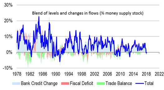 A weakening trend in the trade balance represents a tightening of financial conditions because national accounting identity, private sector saving must equal the sum of the trade balance and fiscal deficits. In other words, if the trade balance is deteriorating, the private sector is saving less in foreign currency terms, contributing to a cashflow squeeze.