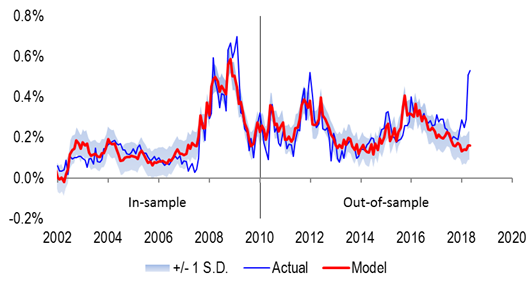 Our proprietary credit impulse indicator aggregates trade, fiscal and credit developments at the margin. Levels and changes in the credit impulse matter, and so we present our blended measure. In early February, the (blended) credit impulse was slightly negative, consistent with relatively tight financial conditions and slower growth. For further discussion of our credit impulse indicator, please see our recent article “Credit impulse turns slightly negative” dated 5 March 2018.