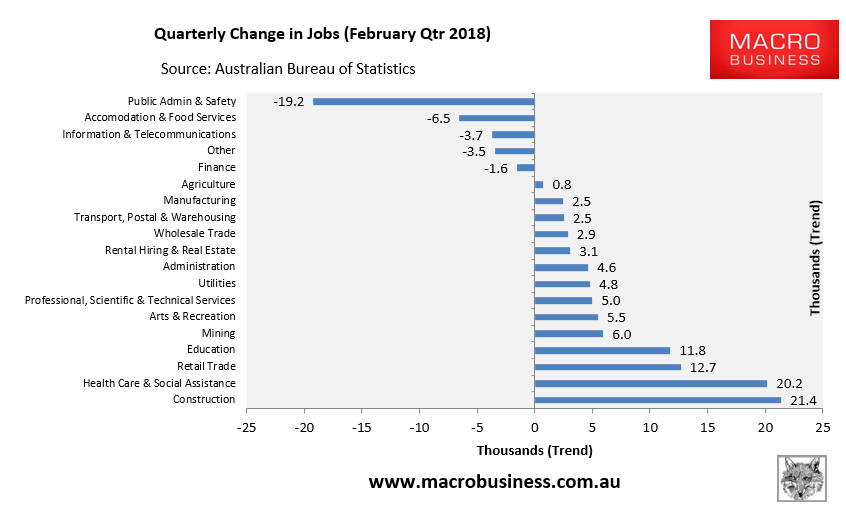 The Australian Bureau of Statistics (ABS) on Thursday released its quarterly labour force report, which breaks-down employment at the industry level to February 2018.