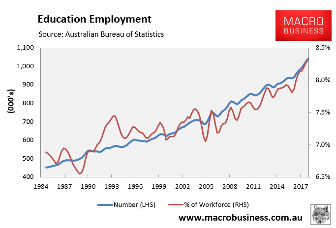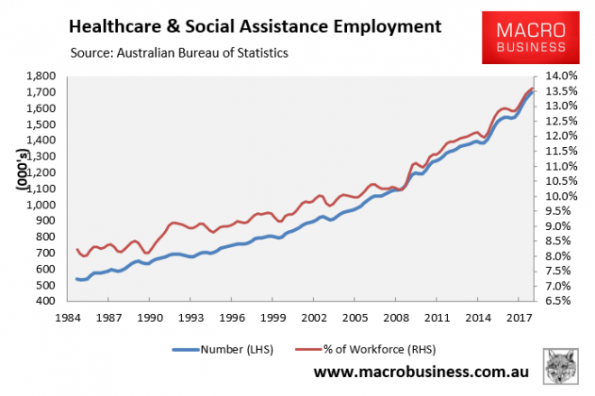 We’ve got booming ‘caring’ jobs in health care & social assistance and education, not to mention public sector jobs. These types of services jobs being created are more about shifting wealth around the economy, rather than creating new wealth. That is, they typically exhibit low productivity, low wages, are non-tradable, and are paid for to a large extent via taxation.