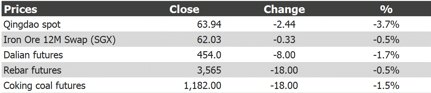 Tianjin benchmark fell $1.40 to $63.75. Paper was hit harder overnight. Rebar stocks drew down to 5.66mt, roughly 30% up year over year.