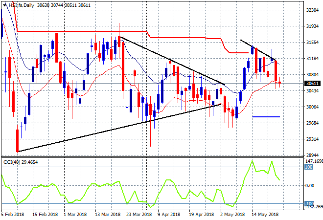 The Shanghai Composite continued its slump after failing to make good on its recent breakout above strong overhead resistance at 3200 , falling nearly 0.5% to close at 3154 points. The Hang Seng Index had a better session, lifting a few points to close at 30710. This keeps the wolves at bay with price right on the low moving average on the daily chart at 30600 as key support that must hold: