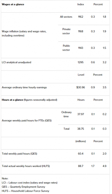- Average total weekly earnings for a full-time equivalent employee increased 3.9% to $1,204.85, which was the largest annual increase since the September 2011 quarter; and