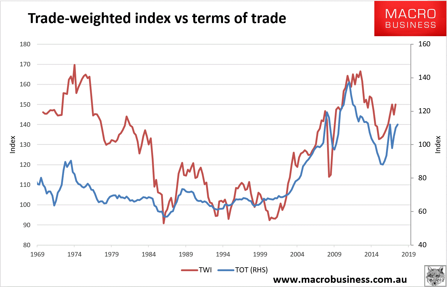 But the real determinant of the currency over the very long term is the terms of trade, in no small part because its income impacts also determine the cash rate: