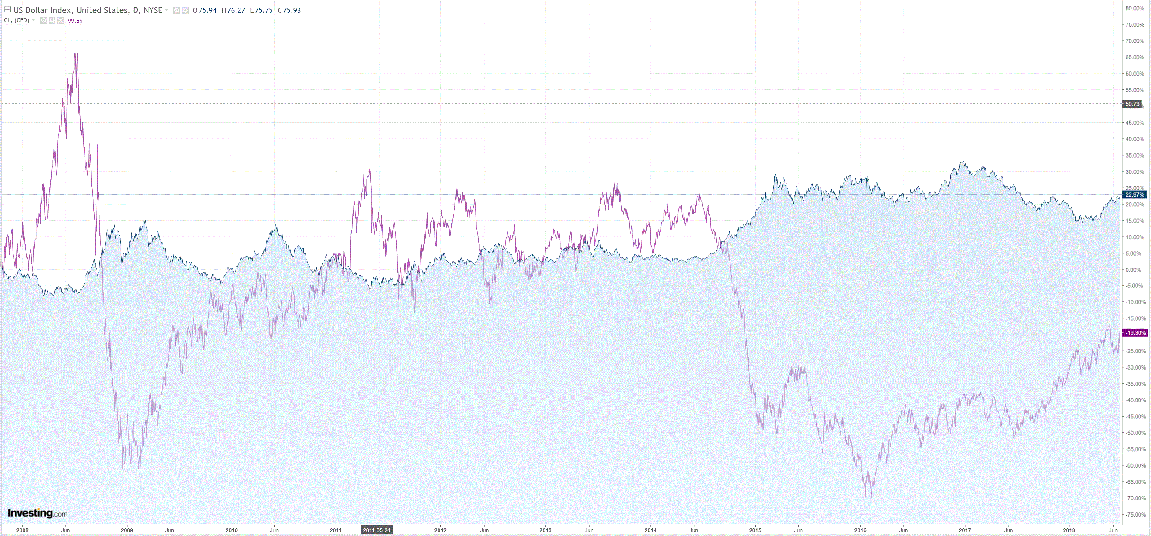 Traditionally higher oil is bad for the US but no longer. Shale production activity has inverted the paradigm and higher oil is a key input into industrial production and higher US wages. So long as oil rises (to a point) and shale overheats in response, the US is going to be booming and the Fed tightening. Hence the big USD spike. This reverses the traditional relationship: