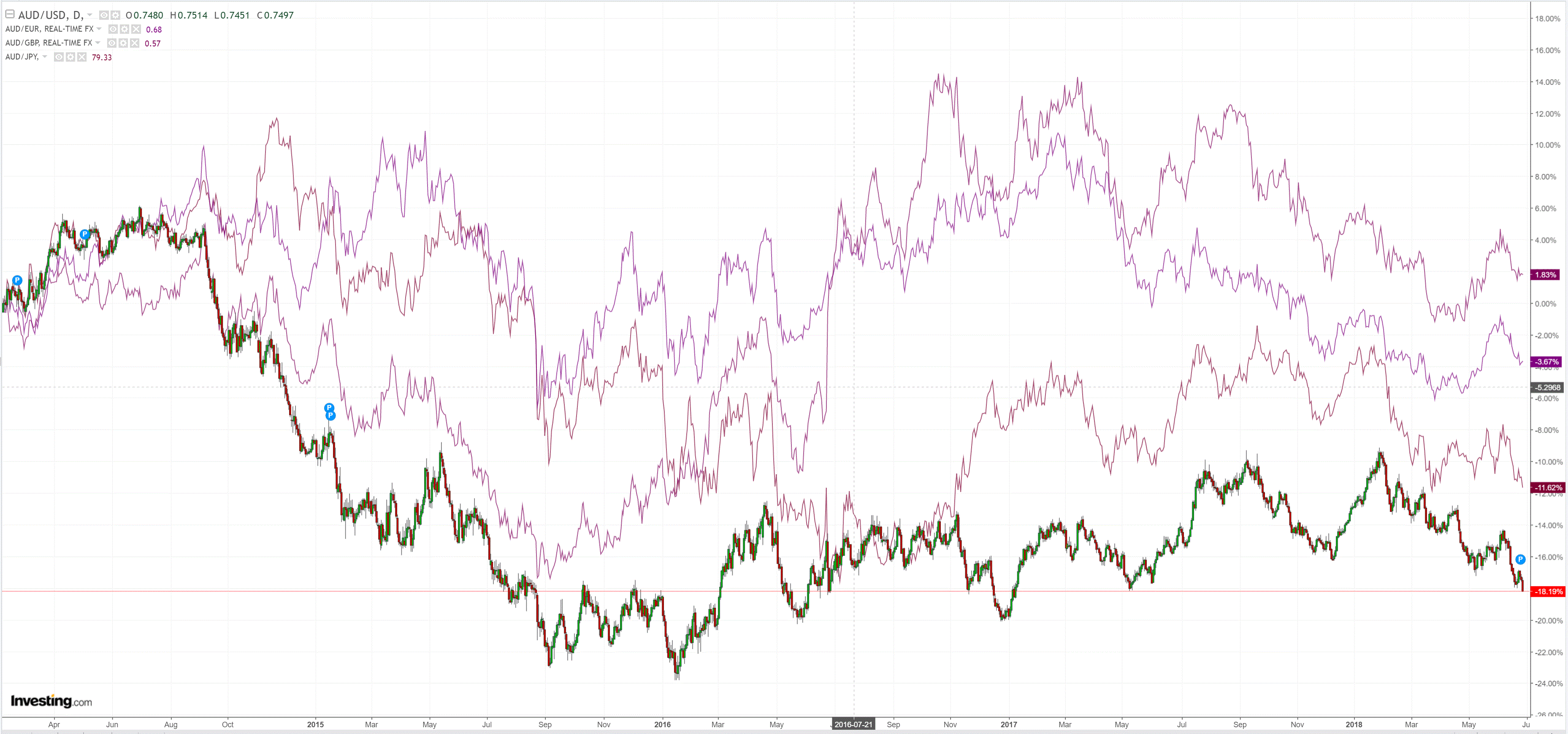 AUD was pole-axed to new closing lows versus developed markets (DM):