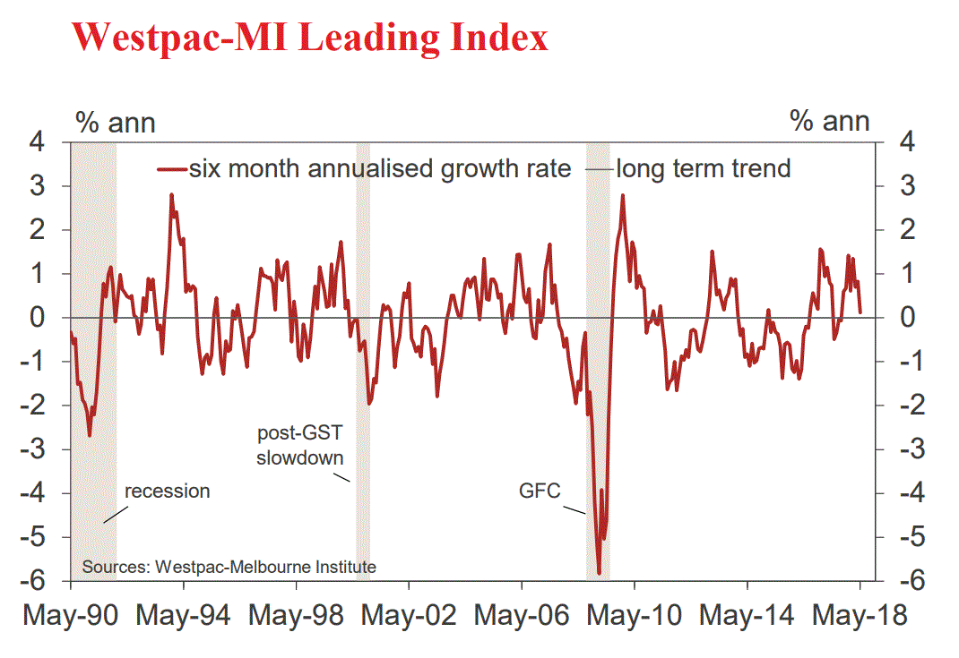 • The six month annualised growth rate in the Westpac–Melbourne Institute Leading Index, which indicates the likely pace of economic activity relative to trend three to nine months into the future, dropped from +0.83% in April to +0.11% in May.