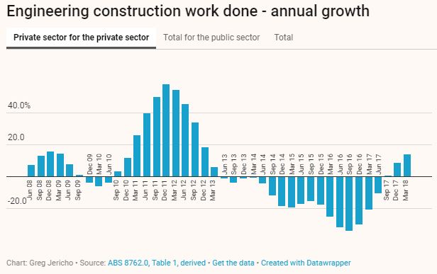 Over the past year engineering construction spending in New South Wales rose by 25% and in Victoria a rather stunning 38%.