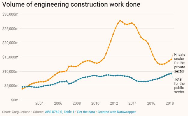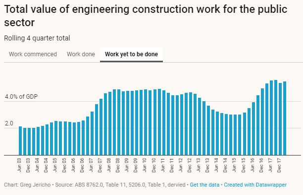 As I noted recently, the private sector in Australia remains less than ebullient, and while this data highlights the sharp falls of private sector investment from the end of the mining boom are now over, the public sector infrastructure projects remain absolutely crucial for keeping the economy growing, and look set to remain so for a number of years to come.