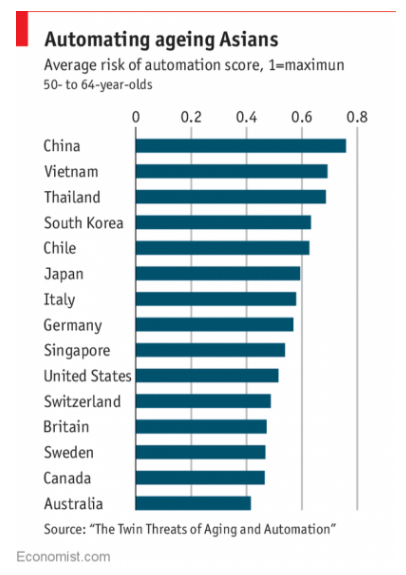 Now, a new collaboration study between Marsh & McLennan’s Global Risk Centre, Mercer, and Oliver Wyman, estimates that Australian workers, like other nations, face a significant threat from automation. From The Economist: