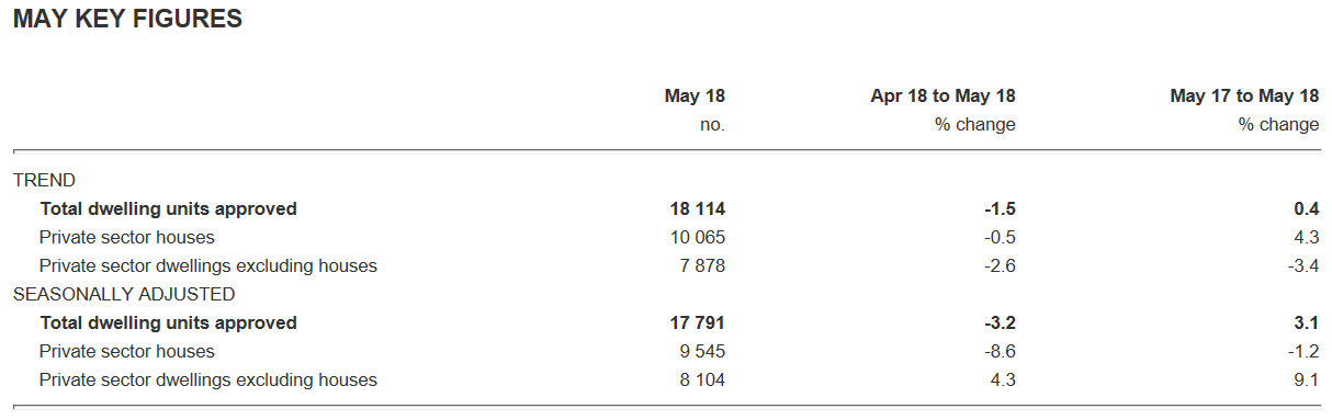 The Australian Bureau of Statistics (ABS) has released dwelling approvals data for the month of May. At the national level, the number of dwelling approvals fell by a seasonally adjusted 3.2% to 17,791. The overall fall was driven by the detached house market (-8.6%), whereas unit & apartment approvals rose by 4.3%.