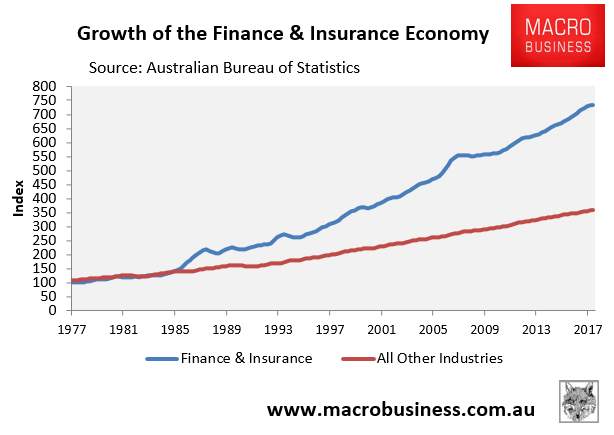 This site has frequently questioned the merits around the explosion of Australia’s financial economy, claiming it has bled the productive economy dry: