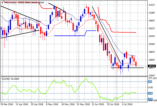 The Shanghai Composite has fallen back below the previous level of support at 2800, down 0.7% to 2793 points as it flounders about. The Hang Seng Index was worse off, down 1.2% to close at 28196 points, returning to the bottom here on the daily chart at 28000 after the false breakout above 28900 previously: