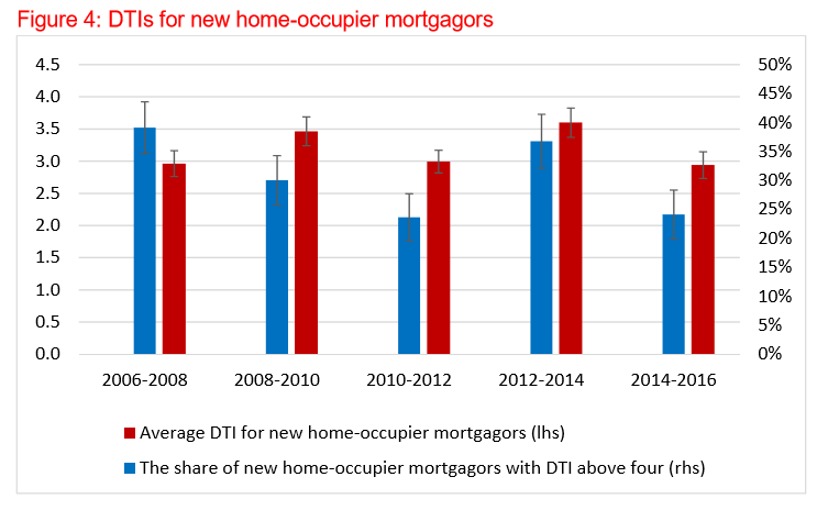 The average debt-to-income (DTI) for new borrowers also declined from 3.6 to 2.9 in the last time cohort and the share of borrowers with a DTI above four declining from 37% to 24%:
