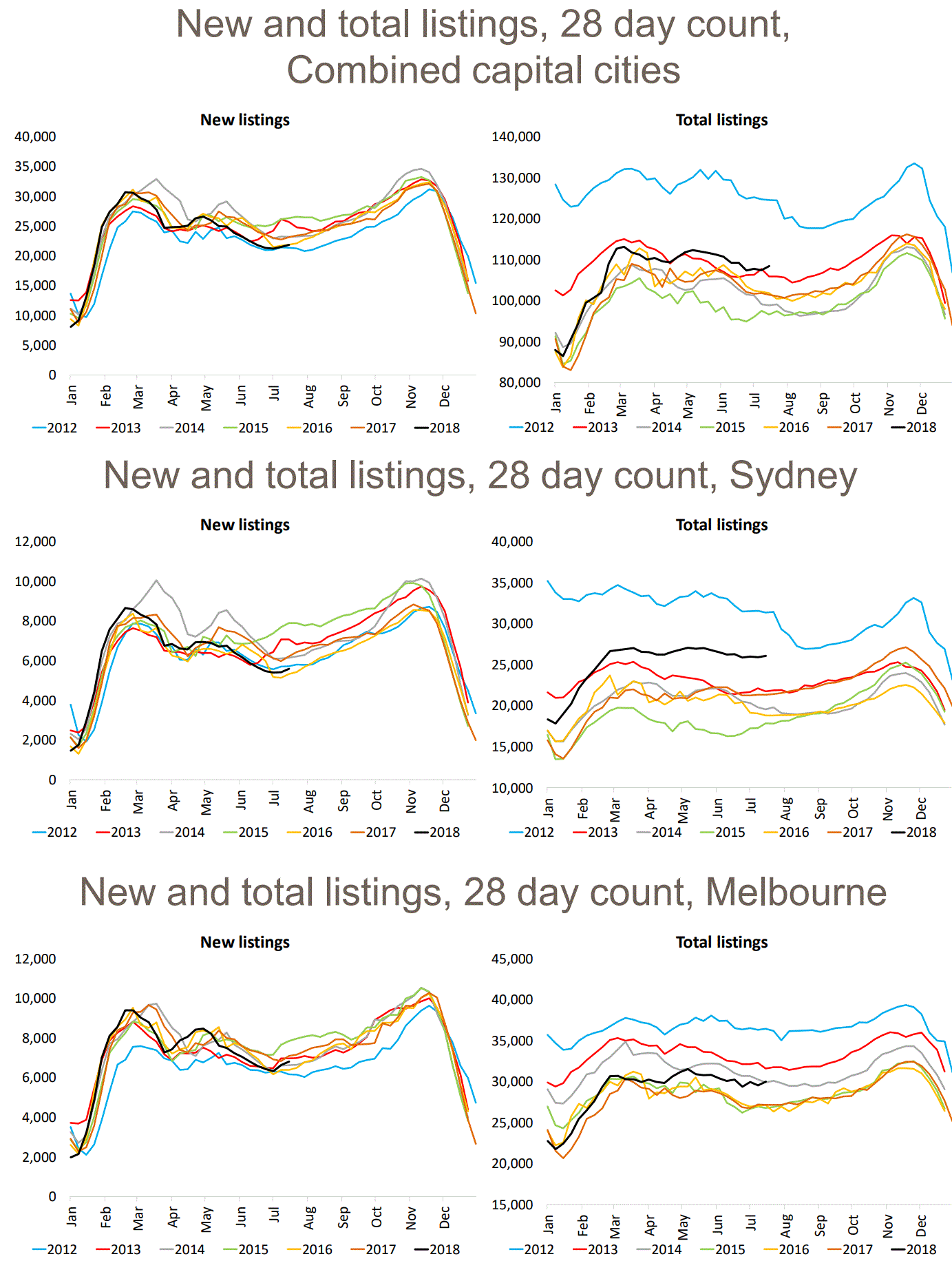 CoreLogic research analyst Cameron Kusher this week takes a look at the current property listings status around Australia. CoreLogic Property Pulse Released: Thursday 26 July 2018 His findings reveal that while capital city dwelling values may well be falling, the market is responding with fewer new listings. However, total listings remain elevated compared to other recent years when housing conditions were much stronger. For this analysis, Mr Kusher has researched listings across each of the past seven years. As referenced in the accompany charts, the x-axis represents the time of year and the y-axis shows the number of properties listed for sale.