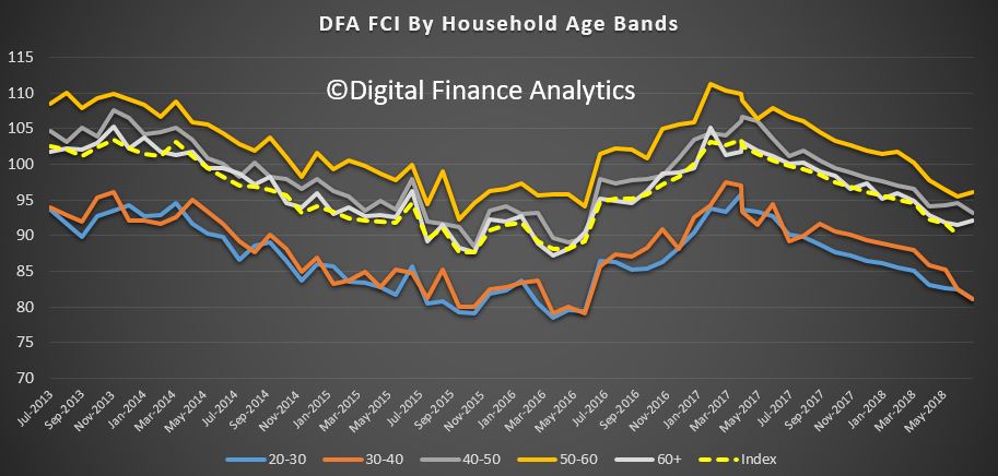 The spread of scores across the states continues to bunch, as NSW and VIC households react to lower home prices. WA continues to show little real recovery in household finance (despite the hype) although there was a small rise in Queensland, thanks to recent pay lifts for some.