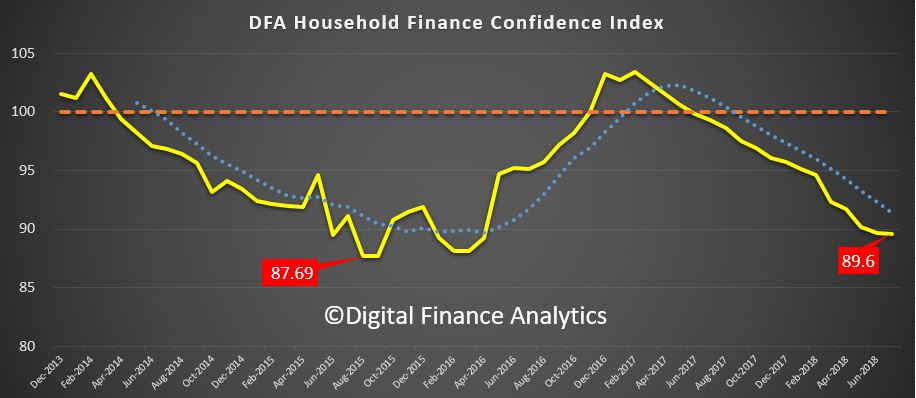 The latest edition of the DFA Household Financial Confidence Index to end July 2018 remains in below average territory, coming in at 89.6, compared with 89.7 last month. We had expected a bounce this month, in fact the rate of decline did slow, thanks to small pay rises for some in the new financial year, and refinancing of some mortgage loans to the “special” rates on offer currently. However, the index at this level is associated with households keeping their discretionary spending firmly under control. And the property grind is still impacting severely.