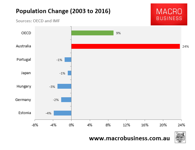 Notably, the bottom two countries with near zero population growth seem to have no problem growing their own economic pie: