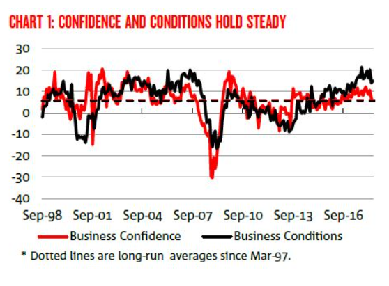 Roy Morgan’s results are broadly matched by the latest NAB business survey, which recorded falls in both business confidence and conditions: