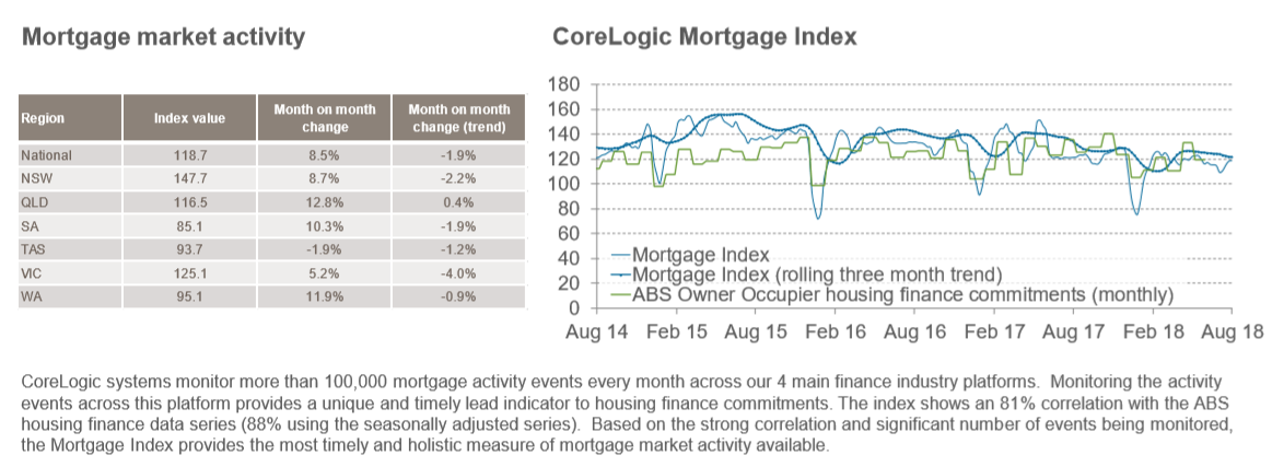 Via CoreLogic comes the leading mortgage index, which has bounced a little but remains well below 2014 levels in trend terms: