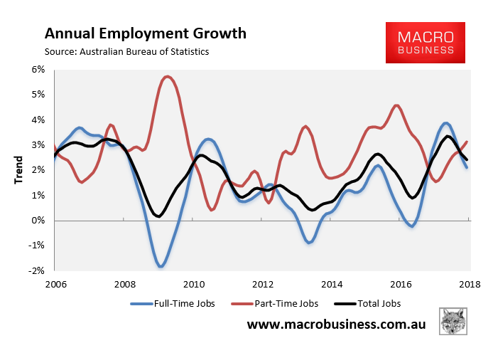 The trend annual growth rate is also fading (+2.4%) on the back of weakening full-time employment growth (+2.1%), whereas part-time employment growth is rising (+3.1%):