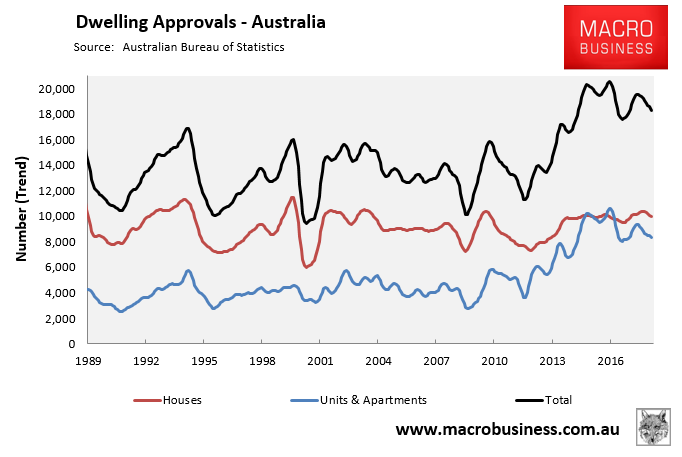 At the capital city level, which is presented in rolling annual terms since it isn’t seasonally adjusted, dwelling approvals across all major markets have fallen from their most recent highs: