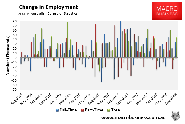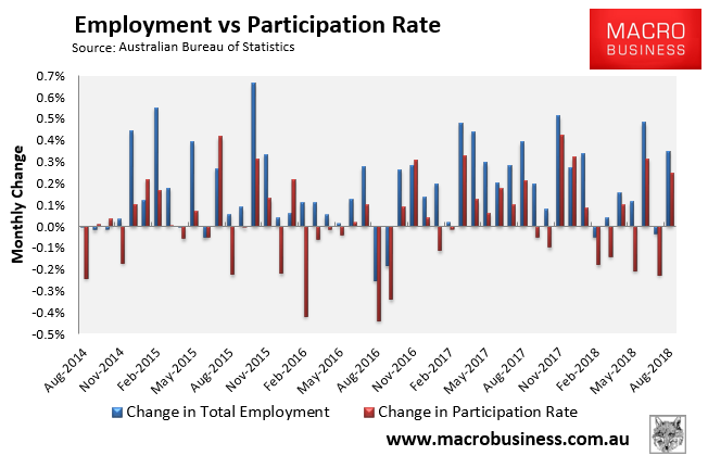 As summarised earlier, the Australian Bureau of Statistics (ABS) today released its labour force report for August, which registered a strong 44,000 increase in total employment but no change in the headline unemployment rate (still 5.3%) because of rising labour force participation.