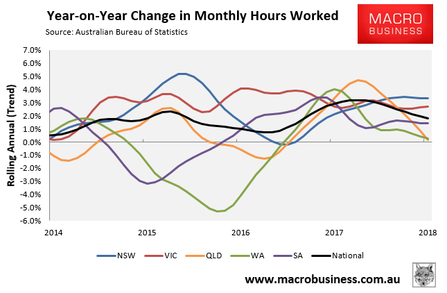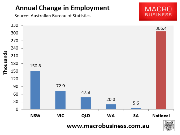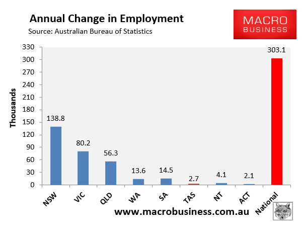 The state seasonally-adjusted figures are notoriously volatile and subject to a big margin of error. As such, the below chart tracks state jobs growth in trend terms. Here, the three major jurisdictions have driven the jobs growth: