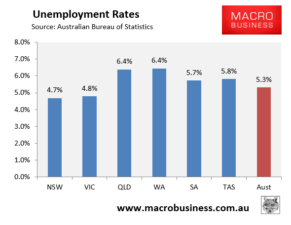 However, the below chart shows the ABS’ more reliable trend unemployment rates, which shows NSW and VIC with the lowest unemployment and WA, QLD and TAS with the highest: