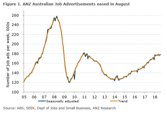 ANZ’S HEAD OF AUSTRALIAN ECONOMICS, DAVID PLANK, COMMENTED: “After a strong rise in January, ANZ Job Ads have followed a sawtooth pattern, in seasonally adjusted terms, leaving the level little different from the start of the year. The monthly trend has also softened – average monthly growth was 1.0% in 2017, compared to 0.4% year to date (with the lion’s share occurring in Q1 2018).