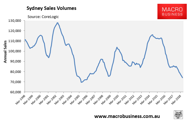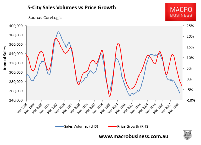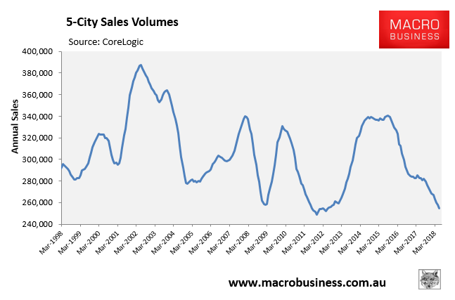 The next chart plots annual sales volumes across the five major markets to May 2018, which are falling fast and plumbing levels not seen since the 2010-12 housing bear market: