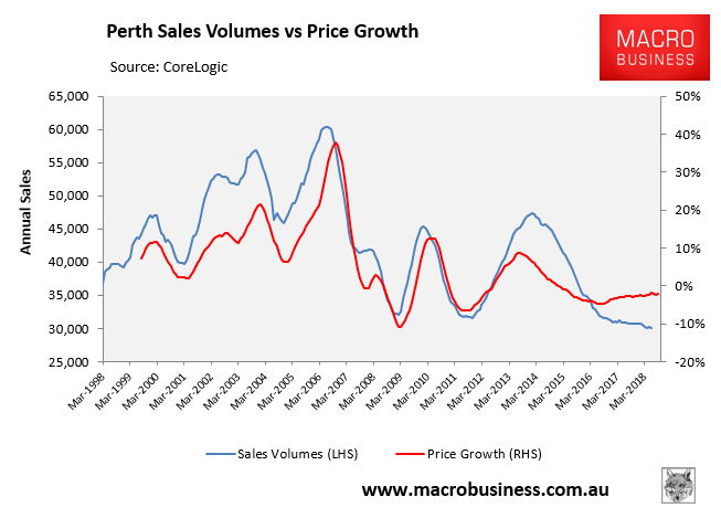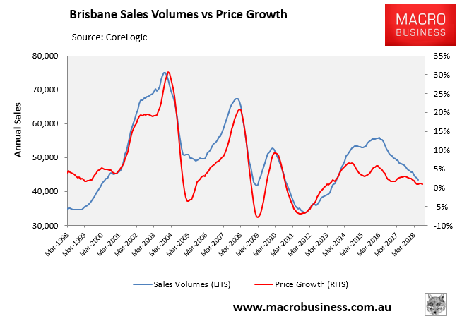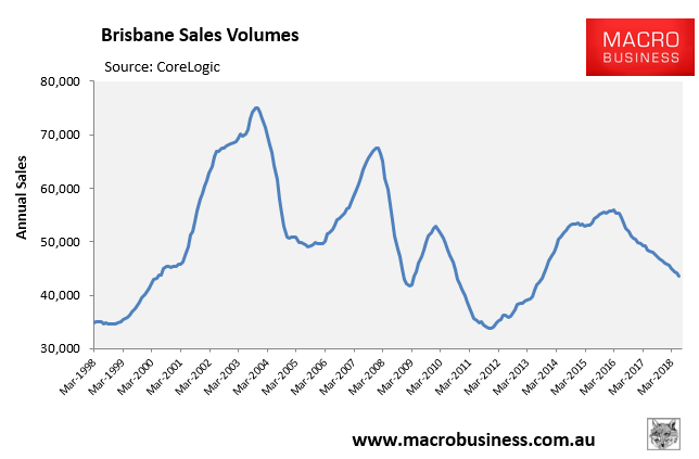 The collapse in sales volumes suggests that Sydney’s, Melbourne’s and Perth’s dwelling values will continue to fall, whereas Brisbane’s could soon follow.