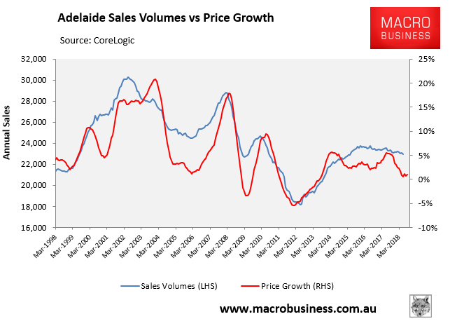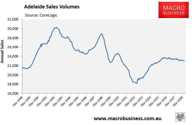 As you can see, sales volumes have fallen heavily across all major housing markets except Adelaide.