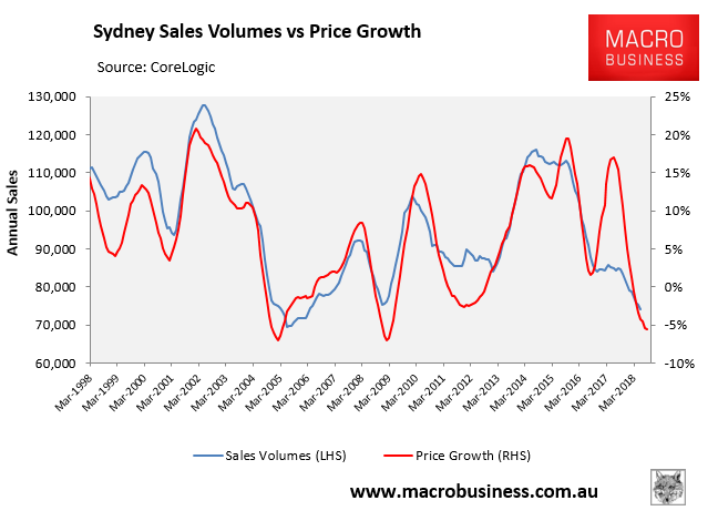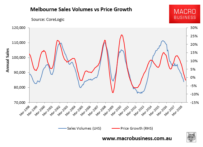 The following charts plot the annual changes in sales volumes and dwelling values, as measured by CoreLogic, which shows a very strong correlation: