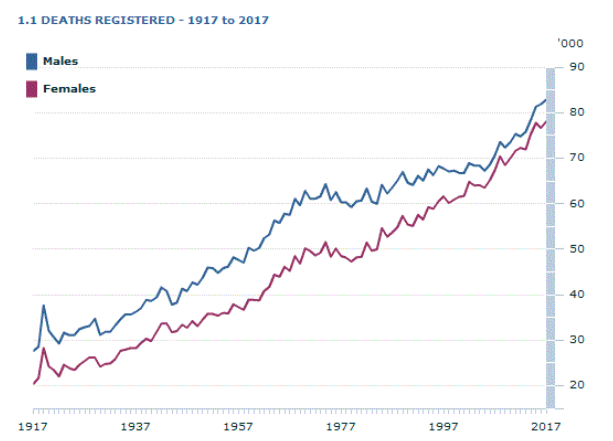 There were 160,909 deaths registered in Australia in 2017, 2,405 more than the number registered in 2016 (158,504). Over three quarters (77.1%) of these deaths were to usual residents of New South Wales, Victoria and Queensland combined. Since 2007, the number of deaths registered has increased by around 1.6% per year on average for males and 1.5% per year for females, with year-to-year fluctuations (see graph 1.1)…