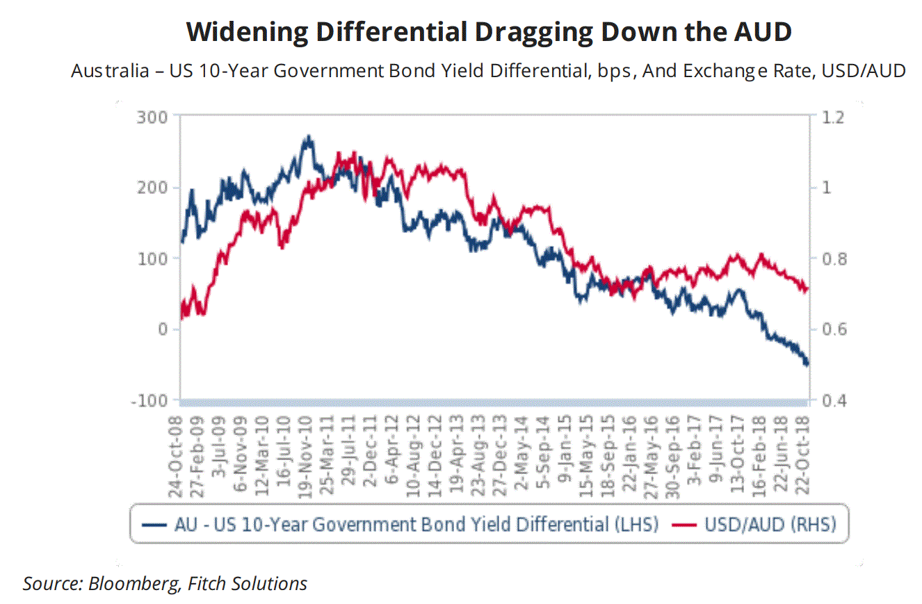 Second, the central bank keeping its policy rate on hold in the near-term will likely result in a further widening yield differential with the US, as the US Federal Reserve is undergoing a rate hiking cycle. We only expect a 25bps rate hike from the RBA by end-2019, in contrast with 100bps worth of hikes from the US Fed over the same period. We expect the widening yield spread to weigh on the demand for Australian debt securities, relative to the US, thereby putting downside pressure on the AUD.